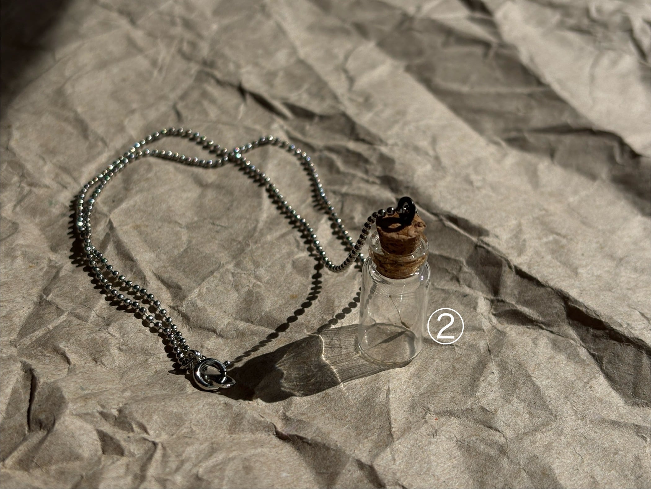 【小瓶(わたげ)ネックレス】小瓶の中に閉じ込められた可愛らしいわたげが、一瞬の美しさを大切にしたアクセサリーです。このネックレスは、わたげの儚さを手元で楽しむことができる特別なアイテムで、あなたのコーディネートをさりげなく引き立てます。